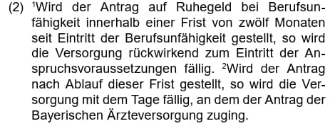 Auch müssen Mitglieder dieses Versorgungswerkes sehr schnell sein, um ihren Leistungsfall anzumelden. Schaffen Sie dies nicht innerhalb der ersten 12 Monate, zum Beispiel weil Sie es noch nicht wahrhaben wollen berufsunfähig zu sein, dann erhalten Sie die BU-Rente maximal ab der Antragstellung auf Leistung und nicht rückwirkend ab Beginn der Berufsunfähigkeit. Geregelt ist das in Paragraph 43 Absatz 2.